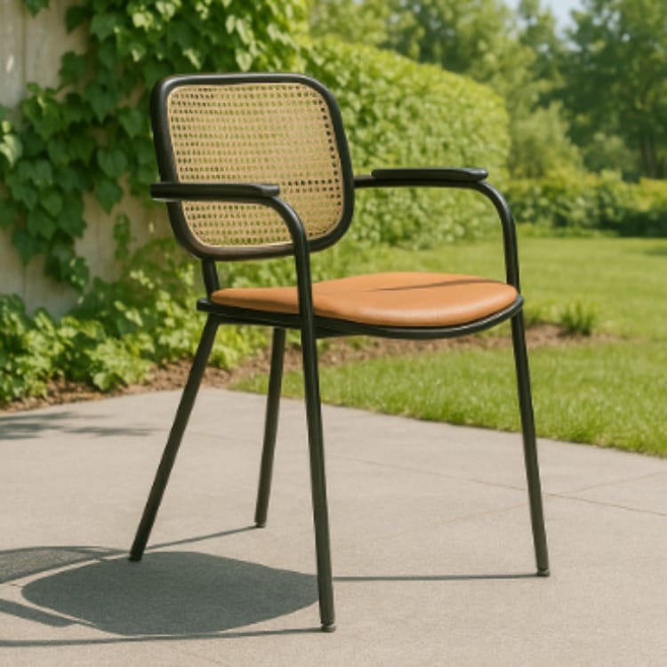 Chiếc ghế có tay vịn mang phong cách retro hiện đại, được thiết kế tinh tế với sự kết hợp hài hòa giữa gỗ, mây và kim loại. Khung và tay ghế làm từ gỗ ash sơn đen mờ, mang đến vẻ chắc chắn, sang trọng nhưng vẫn giữ nét mềm mại nhờ các đường cong thanh thoát. Tựa lưng đan mây lưới tự nhiên tạo cảm giác thoáng mát, nhẹ nhàng và gần gũi, nổi bật trên nền khung gỗ đen, nâu sẫm tương phản. Ghế được thiết kế tay vịn thanh mảnh nhưng vững chắc, vừa đảm bảo thẩm mỹ vừa tạo sự thoải mái khi sử dụng.