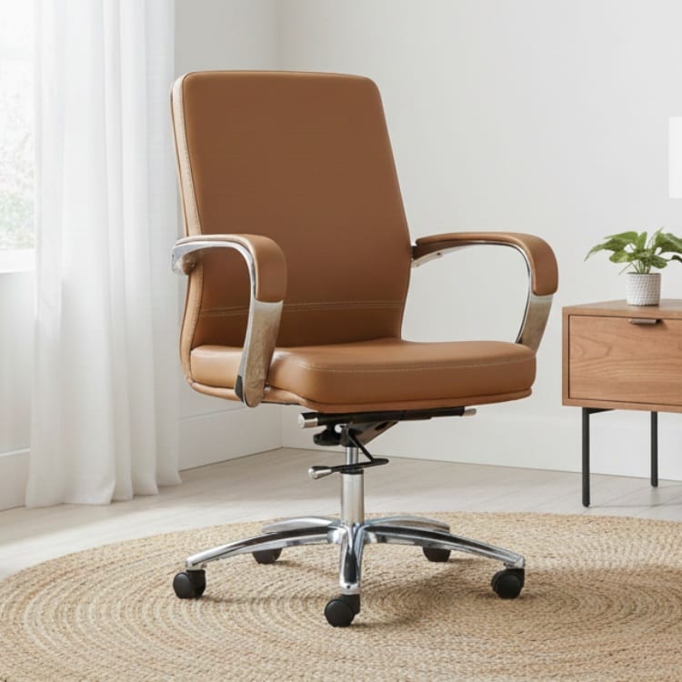 Ghế có đệm dày, độ đàn hồi tốt, giúp phân tán áp lực cơ thể khi ngồi lâu. Tựa lưng cao hỗ trợ tốt cho vùng lưng và vai, giảm mệt mỏi trong quá trình làm việc kéo dài. Tay ghế bọc da kết hợp khung kim loại chắc chắn, tạo cảm giác thoải mái khi tựa tay. Ghế được trang bị trục xoay 360 độ, giúp người dùng dễ dàng di chuyển và thao tác trong không gian làm việc.