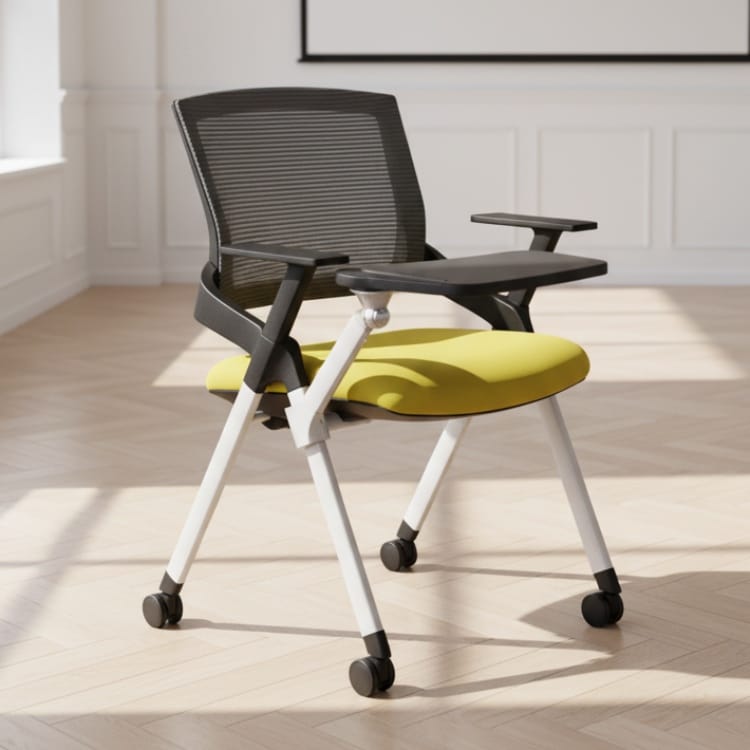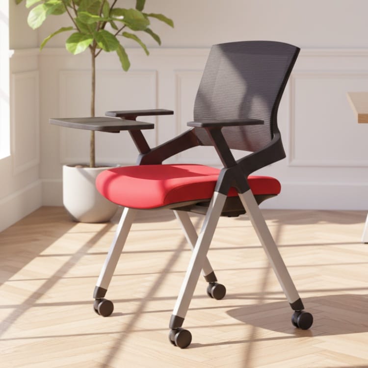 Phần đệm ngồi sử dụng mút bọc nỉ cao cấp, êm ái và đàn hồi tốt, giữ cảm giác thoải mái khi ngồi trong thời gian dài. Chân ghế làm bằng khung thép chắc chắn, kết hợp hệ thống bánh xe xoay 360 độ, giúp di chuyển nhẹ nhàng và tăng sự linh hoạt trong lớp học mà không gây tiếng ồn.