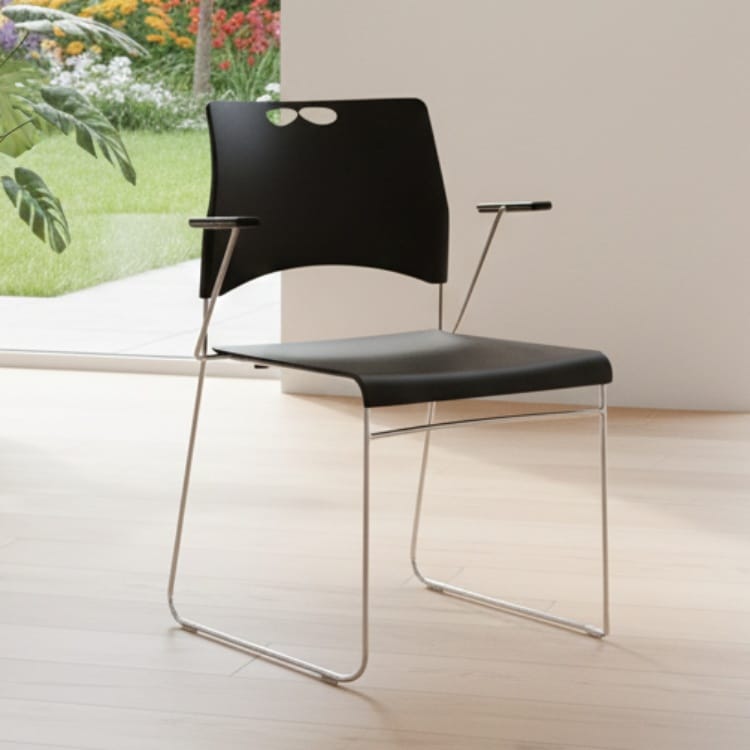 Phần mặt ngồi và tựa lưng của ghế được làm từ nhựa cao cấp, bề mặt mịn, dễ lau chùi và có khả năng chống bám bẩn tốt. Khung chân ghế sử dụng sắt mạ crome, thiết kế dạng chân quỳ giúp ghế luôn vững vàng, chịu lực tốt. Tay ghế đặt ở độ cao hợp lý, giúp người ngồi thư giãn, giảm mỏi vai và cánh tay. Đây là ưu điểm lớn khi ghế được sử dụng trong môi trường văn phòng, phòng họp, phòng chờ hoặc lớp học.