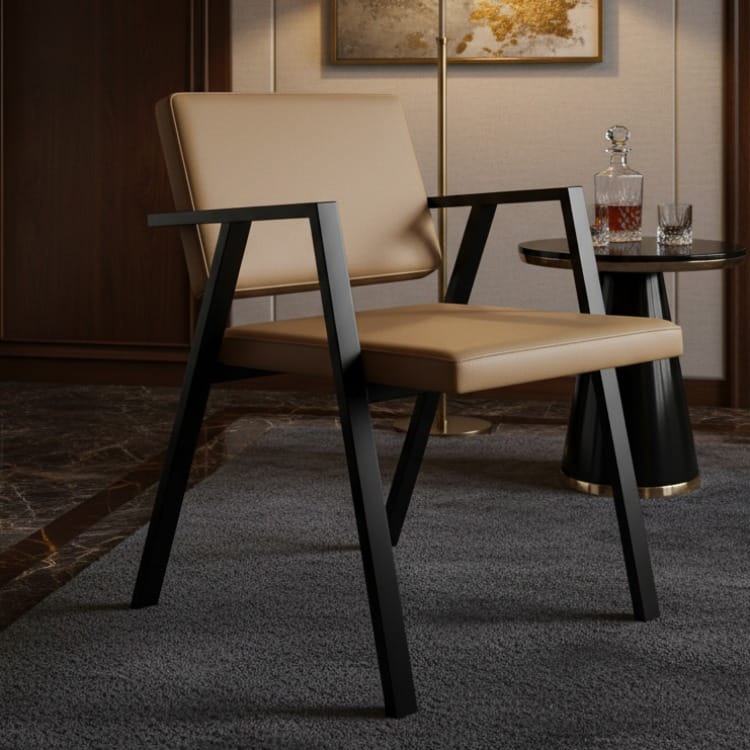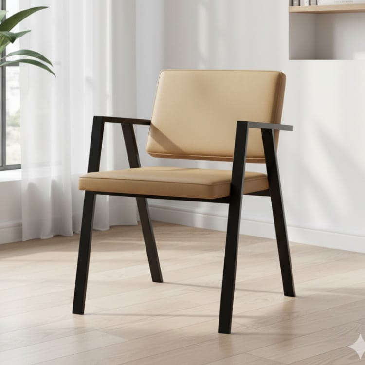 Ghế sắt bọc da có tay vịn nổi bật với thiết kế gọn gàng, các đường khung sắt sơn đen chắc chắn kết hợp cùng phần đệm bọc da sang trọng. Tựa lưng và mặt ghế đệm bọc da hoặc vải được tính toán tỉ lệ hợp lý, tạo cảm giác êm ái và dễ chịu ngay cả khi ngồi lâu. Kiểu dáng vuông vức của sản phẩm giúp không gian trở nên tinh tế và chuyên nghiệp hơn.