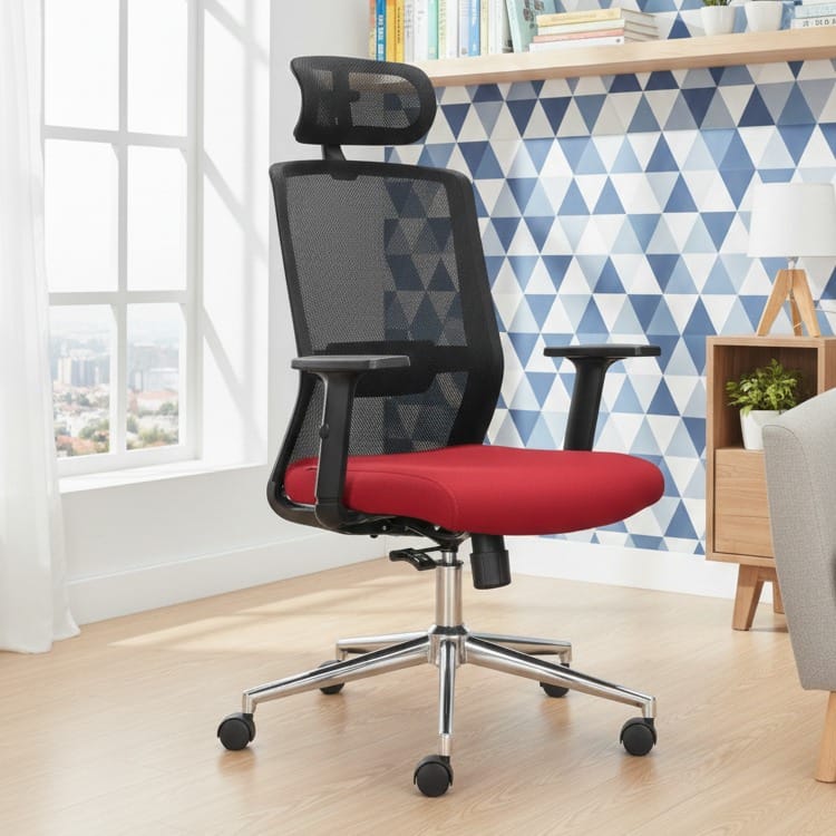 Ghế xoay có tựa đầu nổi bật với thiết kế công thái học thông minh, phần lưng và tựa đầu bọc lưới thoáng khí giúp nâng đỡ cột sống cổ, lưng hiệu quả, hạn chế tình trạng đau mỏi khi ngồi làm việc trong thời gian dài. Ghế được trang bị tựa đầu êm ái, điều chỉnh linh hoạt, hỗ trợ tốt cho vùng cổ và vai gáy. Phần lưng ghế dạng lưới cong theo cột sống, tạo cảm giác thông thoáng, không bí nóng, đồng thời giữ tư thế ngồi chuẩn, giảm áp lực lên thắt lưng.